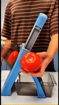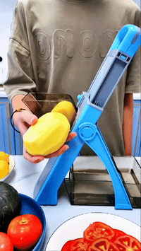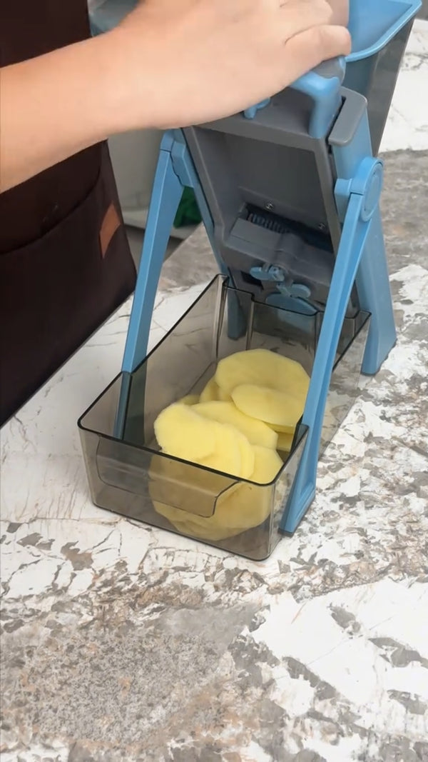 Your fingers never enter the cutting zone. Press from above, the lever does the work, the container catches everything. Mandoline speed without mandoline fear.