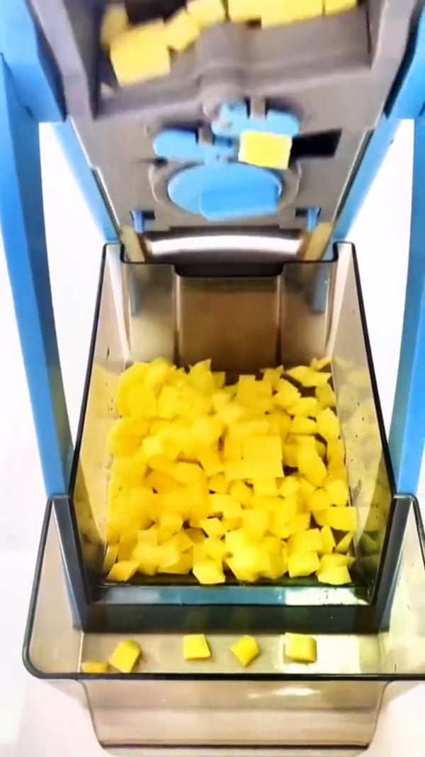 The stationary grid shears (never tears). Every piece the same size. Even cooking. Even flavor. Restaurant consistency at home.