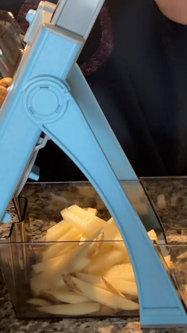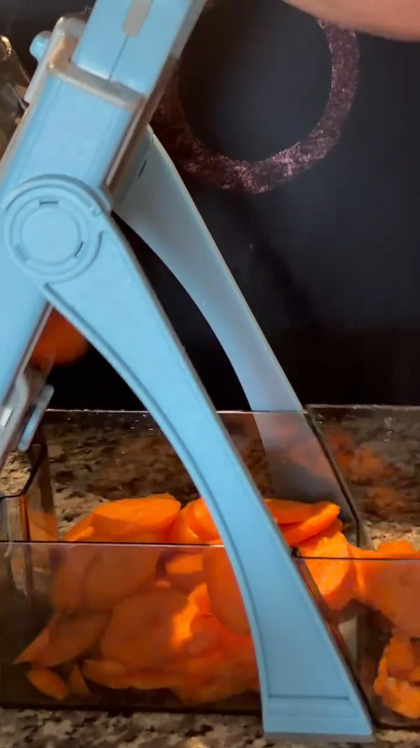 The hinge multiplies your pressure by 5x. Sweet potatoes, carrots, butternut squash. One steady press, clean cuts. No slamming. No wrist strain.